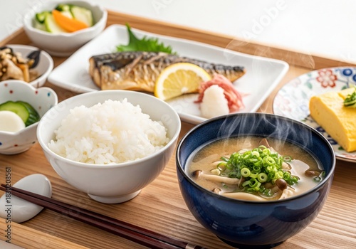 Traditional Japanese Breakfast with Grilled Mackerel, Steaming Miso Soup, Rice, and Pickles on Wooden Tray