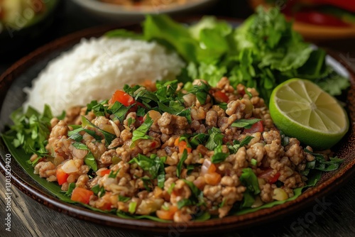 Traditional Laap dish with fresh herbs, zesty lime, and toasted rice
