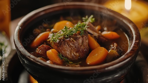 Traditional Lamb Stew with Carrots and Herbs in a Rustic Pot with Soft Lighting and Empty Copyspace for Text Overlay