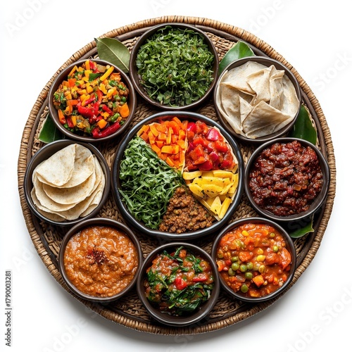 Traditional Mexican appetizer platter featu assorted salsas dips and fresh salad served in small bowls on woven tray for authentic cuisine