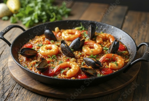 Traditional seafood paella with shrimp and mussels in black cast-iron skillet