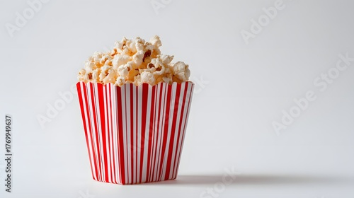 Traditional striped container filled with freshly popped corn kernels sits against a bright backdrop