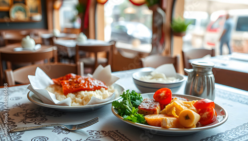 Traditional Turkish food at restaurant, papercraft. with white shades