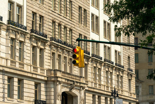 Traffic light signal in the city. American style yellow traffic light in New York City. Traffic in the city. Background with classical buildings.
