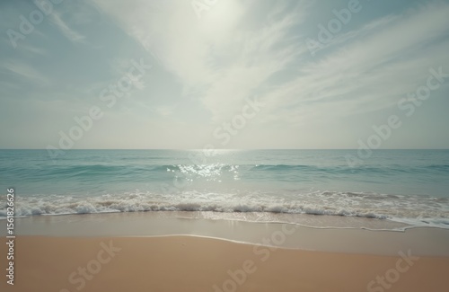 Tranquil beach scene. Gentle waves rolling on sandy shore. Azure ocean meets cloudless sky. Peaceful vacation, travel, coastal paradise. Sun shines, summer mood, vacation, horizon.