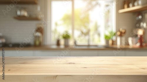 Tranquil dining arrangement featuring empty wooden table against blurred state-of-the-art kitchen