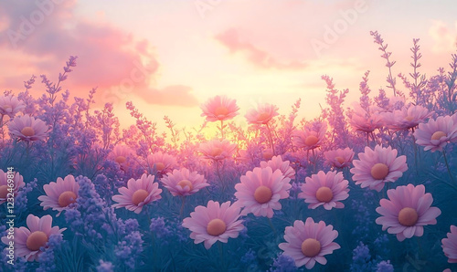 Tranquil Field of Daisies Glowing Under a Dreamy Pastel Sunset with Peach and Lavender Skies