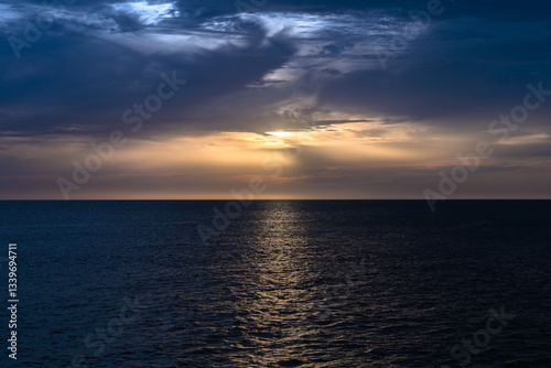 Tranquil sea sunset with dramatic clouds and reflections