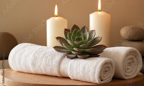Tranquil spa setting with soft lit candles, rolled white towels, and a succulent plant evokes relaxation and wellness for a peaceful escape