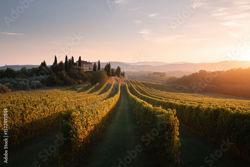 Tranquil Tuscan landscape vineyard rows leading to a hilltop villa under a warm sunset glow. Evokes peace, abundance, and the beauty of nature. Ideal for travel or lifestyle content.