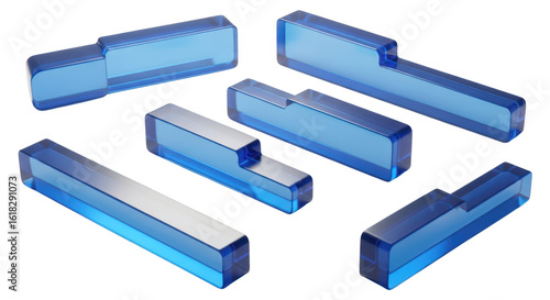 Transparent blue puzzle pieces scattered on a white surface implying construction concept and technology with a subtle gradient in the background useful for graphic design