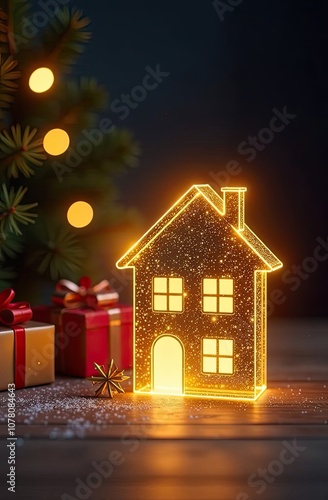 Transparent gold luminous symbol of house and a gift box under Christmas tree on Christmas background with golden glitter. Real estate, realtor, mortgage, insurance, booking.