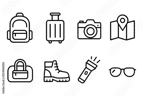 Travel essentials icons featuring backpack, luggage, camera, map, bag, boots, flashlight, glasses, vector illustration