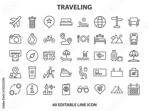 Travel icon set. Summer vacations and holiday symbol vector illustration. Collection of traveling and tourism elements.