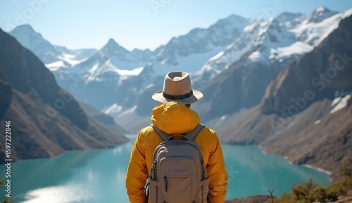 Traveler with Backpack Admiring Mountain Lake View