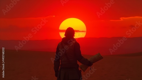 Traveler with Map at Desert Sunset: A lone figure journeys across the arid terrain with red sky