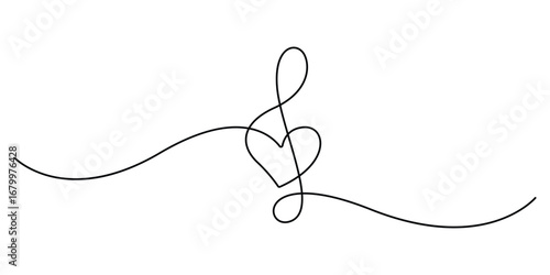 Treble clef music notes with love sign continuous one line drawing. Doodle vector illustration