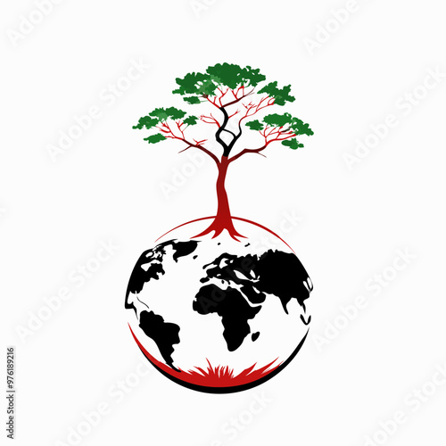 Tree growing on a globe symbolizing environmental protection and sustainability on a white background