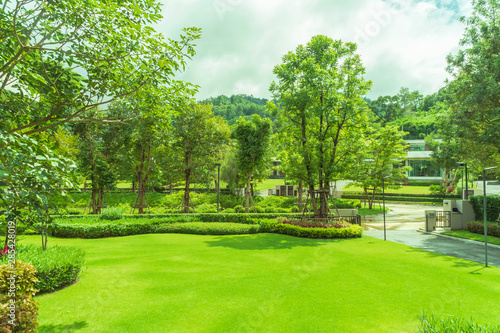 Trees in the park, The evening shines through the trees down to the lawn of the front of the house beautifully, green lawn, Front lawn for the background, designed a beautiful shady landscape garden