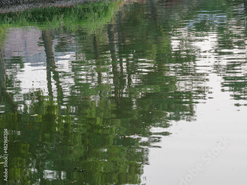 Trees reflected in quiet water