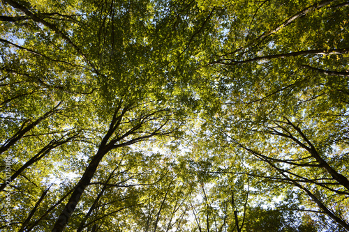Trees with green leaves. Natural green background. Bottom view
