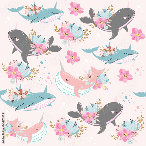 Trend blue and grey whale, narwhal and flowers seamless pattern on a pink background. Doodle boho style. Design for kids. Vector illustration