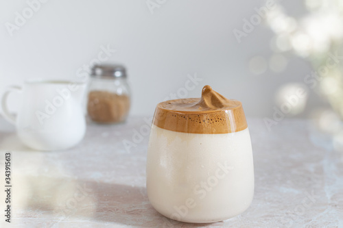 Trendy korean dalgona coffee on pink marble table