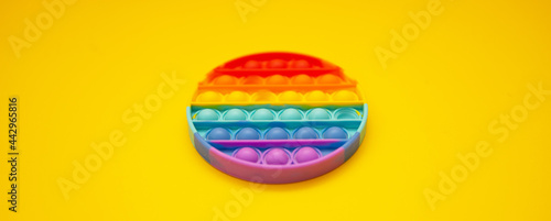 Trendy rainbow Pop it finger toy on a yellow background with copy space. Antistress toy for children and adult.Colorful toy.