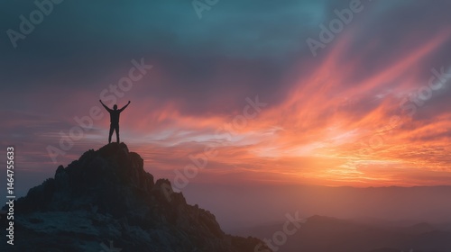 Triumphant Silhouette of a Man Standing on a Craggy Peak Against a Dramatic Sunset Sky with Vibrant Colors Reflecting Hope and Achievement