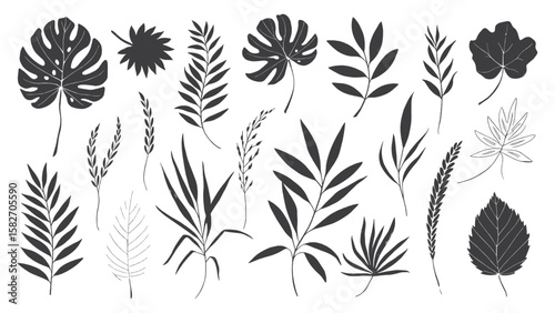 Tropical and botanical leaf silhouettes collection with jungle plants, exotic foliage, and floral design elements in black and white