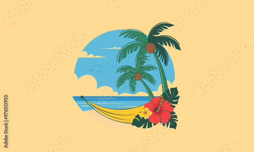 Tropical beach scene with hammock, palm trees, and flowers