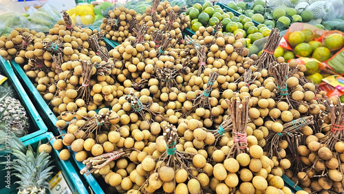Tropical Fruit Bounty: An abundant display of fresh longans and vibrant limes fills the frame, showcasing the colors and textures of a market.