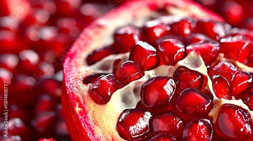 Tropical Growth Ruby, Captivating Macro Shot of Sliced Pomegranate Revealing Vibrant Red Seeds and Glistening Juice