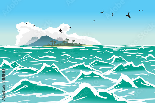 Tropical island wave. Sea summer landscape. Vector cartoon flat illustration