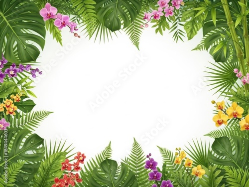 Tropical Plant Border Frame with Lush Greenery and Flowers.