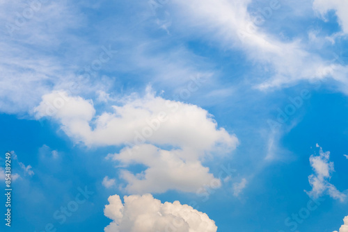 Tropical summer blue sky fluffy white cloud summertime on light sunny day cloudscape. Clear bright blue skyline spring sunlight climate background. Heaven blue environment ecology high scenic nature.