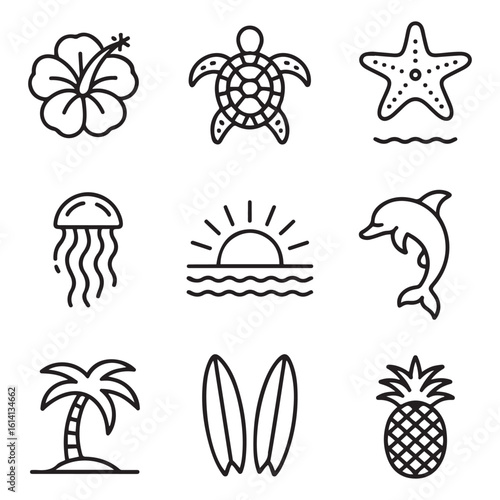 Tropical Summer Line Art Icon Set Featuring, Jellyfish, Turtle, Sunset, Surfboards, and Pineapple – Perfect for Beach and Ocean Vacation Themes, Vector modern illustration, Graphic Design