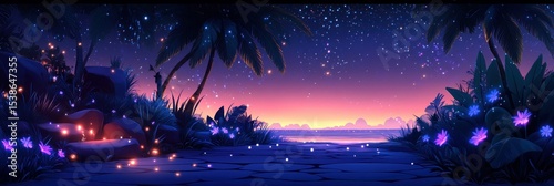 Tropical Twilight: Palm Trees, Sea, and Starry Night