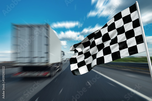 Truck driving along road. Finish flag near cargo van. Logistics transport with speed effect. Rear view of truck on highway. Lorry with white body. Truck delivers goods. Freight logistics transport