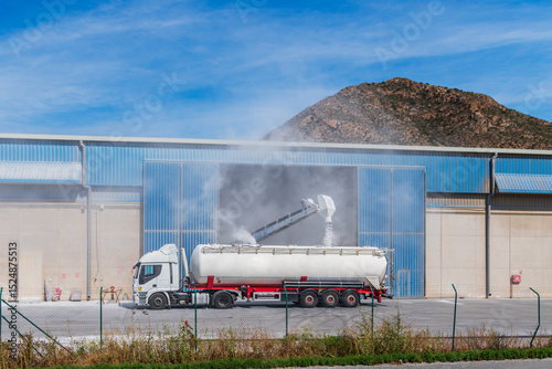 Truck with a powder tanker, also known as a silo trailer, being loaded from the top hatch via a conveyor belt, creating a cloud of dust around it.
