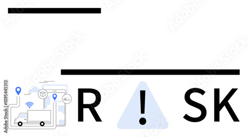 Truck with GPS tracking, map, and warning symbol. Ideal for logistics, transportation safety, fleet management, supply chain, risk assessment technology integration timely delivery. Line metaphor