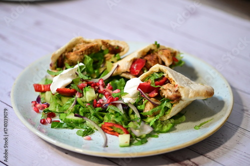 turkish kebab on plate with pita bread