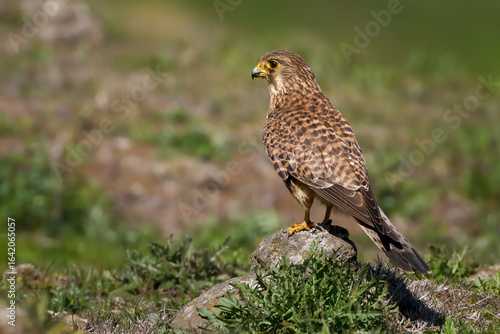 Turmfalke (Falco tinnunculus canariensis) Weibchen steht auf einem Stein in einer wilden Wiese - nahe Mirador de Jinama, El Hierro