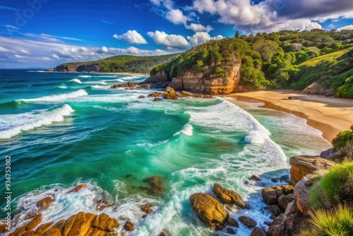 Turquoise ocean waves crash against the rocky shores of Tathra Beach, Australia, surrounded by lush greenery and a serene atmosphere on a sunny day.