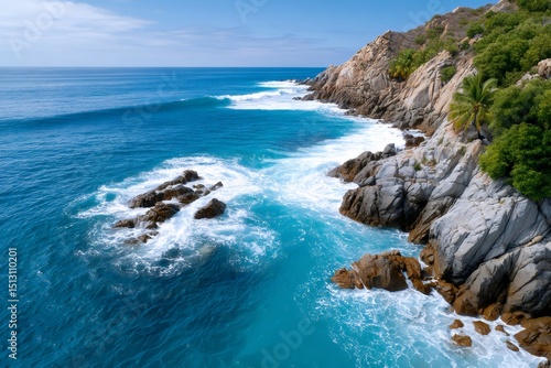 Turquoise waves crashing on the rocky coast of Mexico
