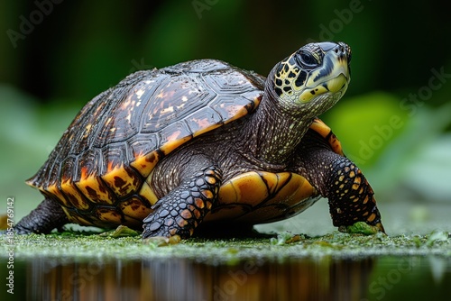 Turtle peeking from protective shell in natural habitat