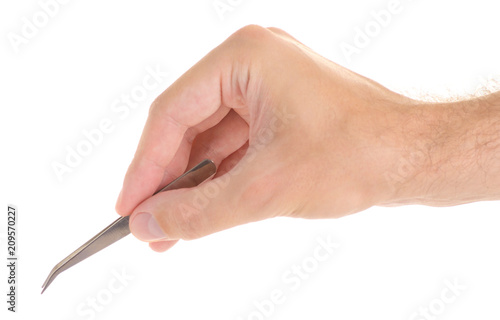 Tweezers in hand on white background isolation
