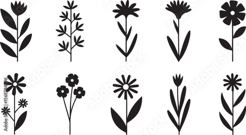 Twelve Black Silhouettes of Stylized Flowers and Plants on White Background Simple Vector Floral Design Elements Botanical Illustrations for Textile