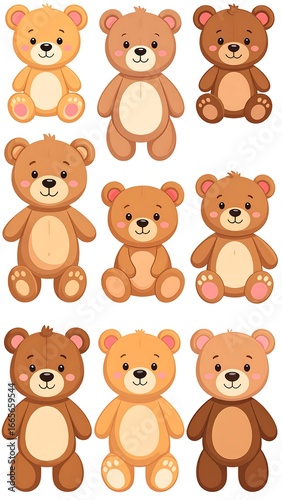 Twelve teddy bears, various poses, white background