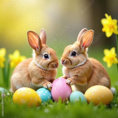 Two adorable rabbits playing amongst vibrant Easter eggs and daffodils , fun, happy
